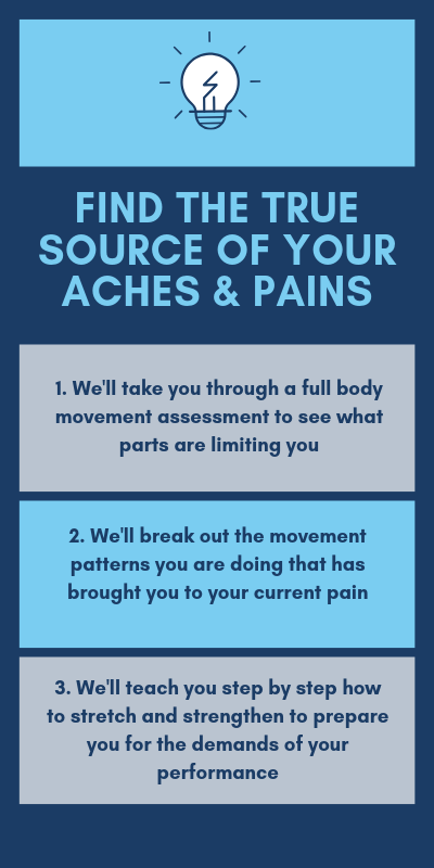 I aim to get to the root of the movement or posture pattern that is causing the spasming, tightening, throbbing, grabbing, aching, slowing down, altering, and breakdown in our bodies. Resetting, reinforcing, and reloading our movement patterns changes how we move. When we can change how we move, we can move well and can move the way we are being asked to move for several more rounds.